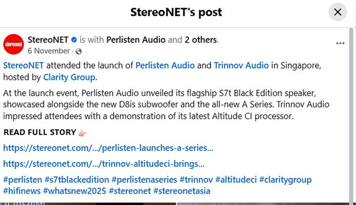 Clarity In The Media Digital Media Perlisten / Trinnov Event StereoNET Feature StereoNET 6 November 2025 Perlisten StereoNET Feature StereoNET 6 November 2025 The Straits Times Article The Straits Times 2 October 2025 KORDZ x Clarity Partnership Announcement ProAVLAsia 5 September 2025 CANVAS HiFi StereoNET Facebook Feature StereoNET 28 August 2025 CANVAS HiFi StereoNET Article Feature StereoNET 28 August 2025 AltitudeCI StereoNET Feature StereoNET 27 August 2025 Media